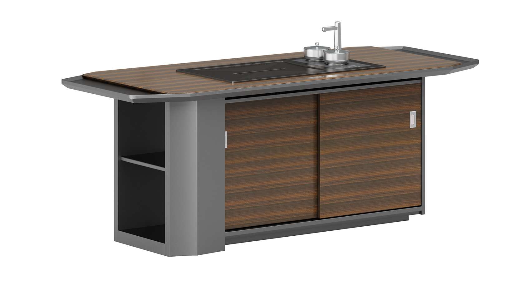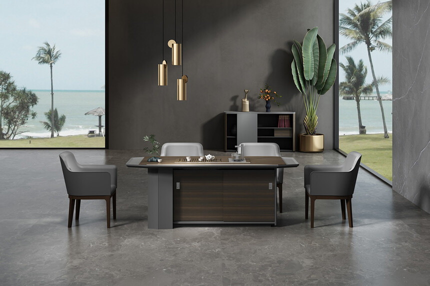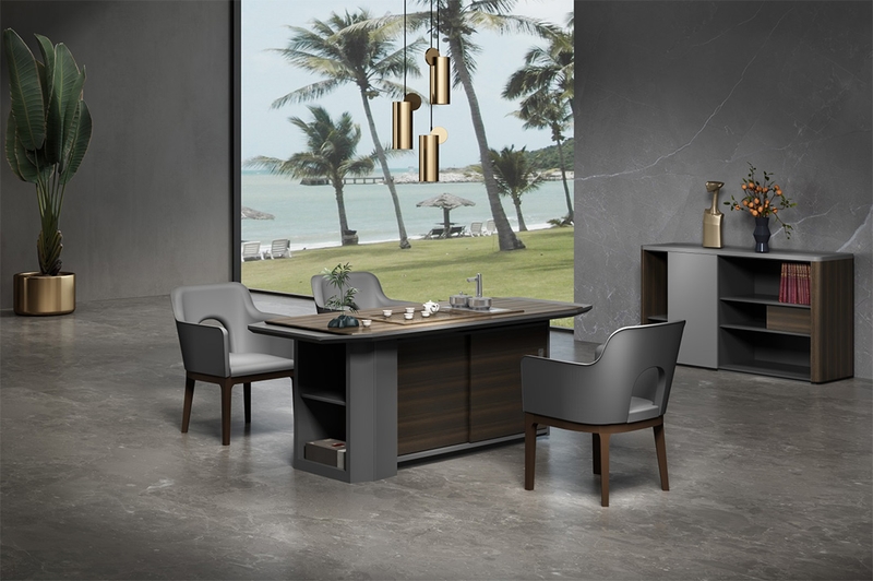 慕格斯將極具立體感的主色煙熏尤加利與星空灰輔色立體結(jié)合,相互依襯,為辦公空間平添意趣;整體采用高科技制作工藝,多面切割,塑造線條,立體感和科技感強烈。