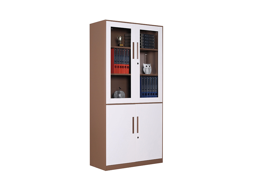 ● 一體結(jié)構(gòu)設(shè)置,上部玻璃對開門,內(nèi)置1層層板可調(diào)高度,內(nèi)置物品可視,便于拿取,中間2個抽屜,下部對開鐵門、門內(nèi)一格板,設(shè)置有拉手和鎖。