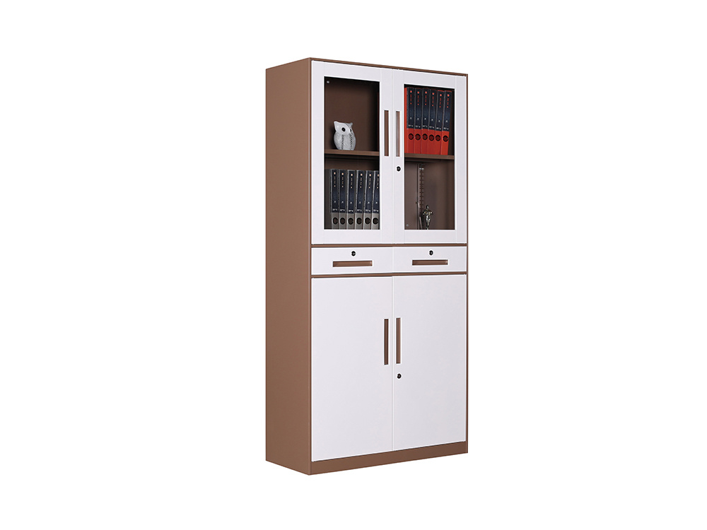 ● 一體結構設置,上部玻璃對開門,內置1層層板可調高度,內置物品可視,便于拿取,中間2個抽屜,下部對開鐵門、門內一格板,設置有拉手和鎖。