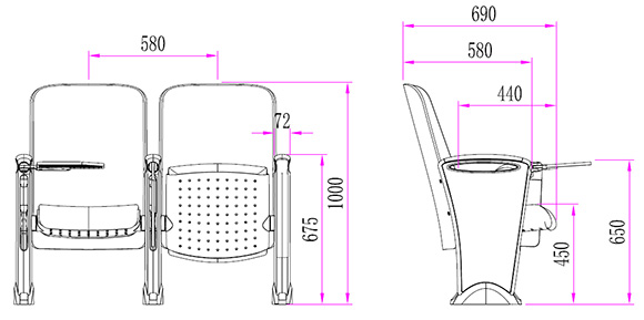 2.座椅基本中心距為580±10mm,座包打開側(cè)深690±10mm,座包深度440±10mm,基本椅高為1000±10mm。最小排距:900mm。